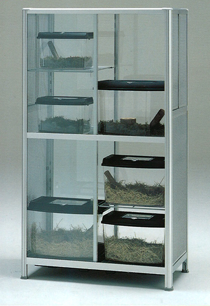 - 天井ガラス (弊社では別売りの別注天井パンチングプレートをご用意していますので必要な方はお問い合わせ下さい。これを使用するとケージの上に他社製品の紫外線ライトなどを置く事ができます。また1508Sの温室にも網目パンチングプレートは使用できます。)