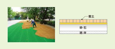 ターフパーキングの隙間に、半分程度(25mm)を目安に良質の客土を入れます。